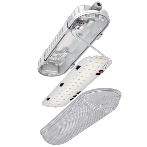 В базовом исполнении источник питания в пластиковом корпусе расположен внутри корпуса светильника. В исполнении «Эко» компоненты источника питания расположены на светодиодной плате.